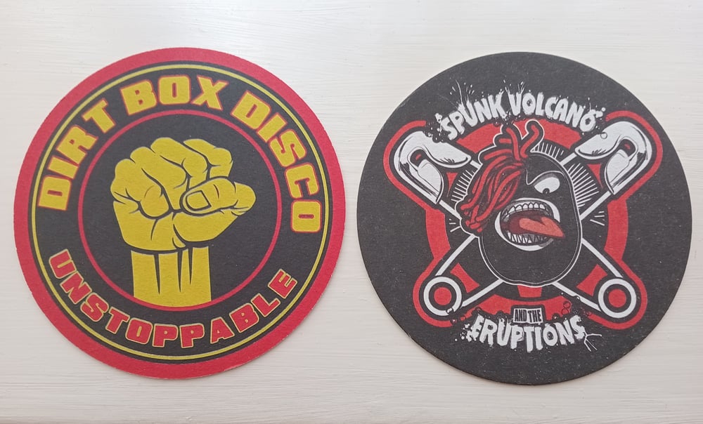 11cm beer mats, Spunk Volcano on one side Dirt Box Disco on the other.